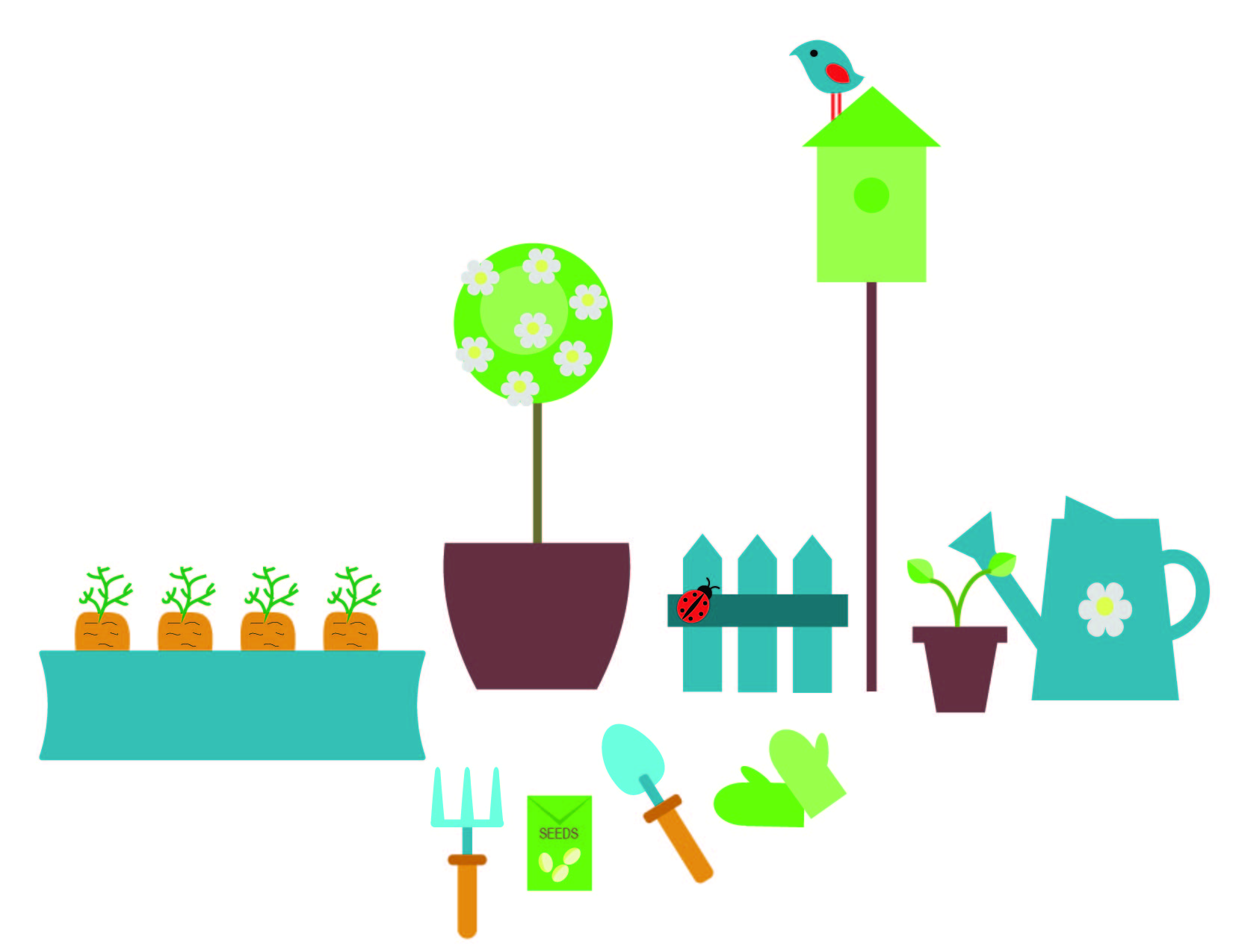 - To create objects that look more true to form, I used to the ellipse tool, then used the Direct Selection tool to drag anchor points to manipulate the corners of the objects (carrot, shovel, garden gloves).