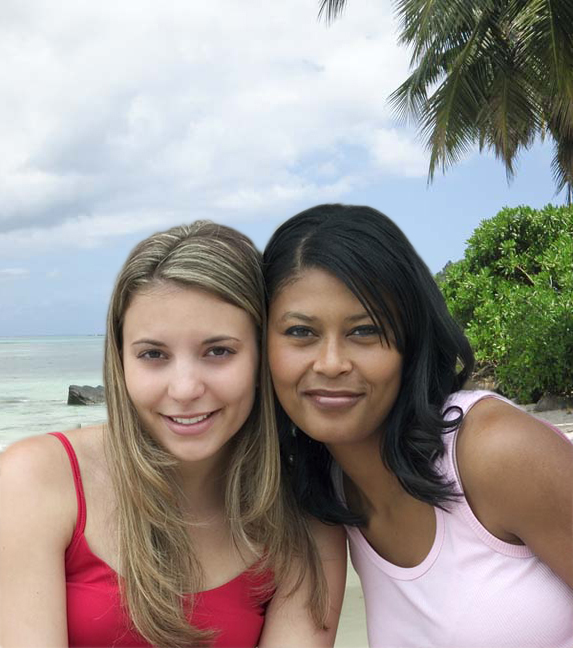 On the second image of the girls on the beach, I selected the girls with the “direct selection tool” then used the same tool, the “add vector mask” to replace the grey background with the beach background.